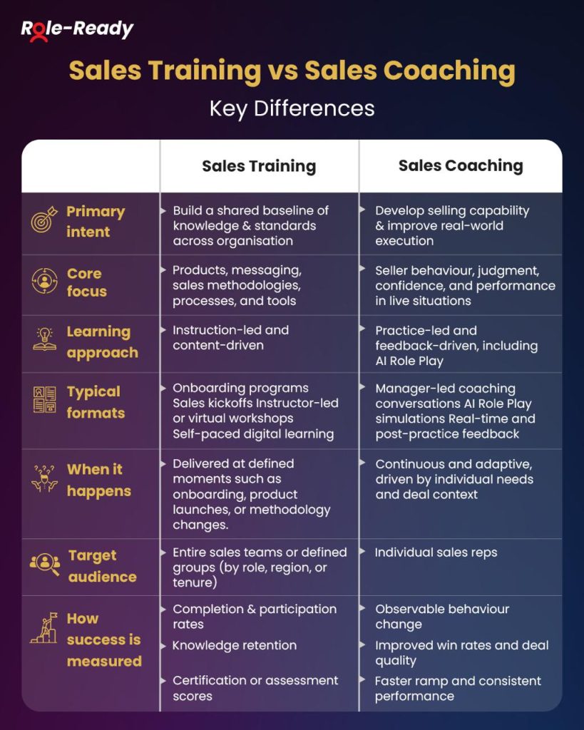 This is where an important distinction often gets blurred: sales training versus sales coaching. The two are frequently used interchangeably, but they serve very different purposes. Understanding that difference, and more importantly, designing for both, is one of the most critical responsibilities of modern revenue leadership.